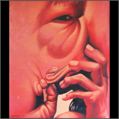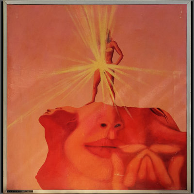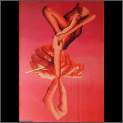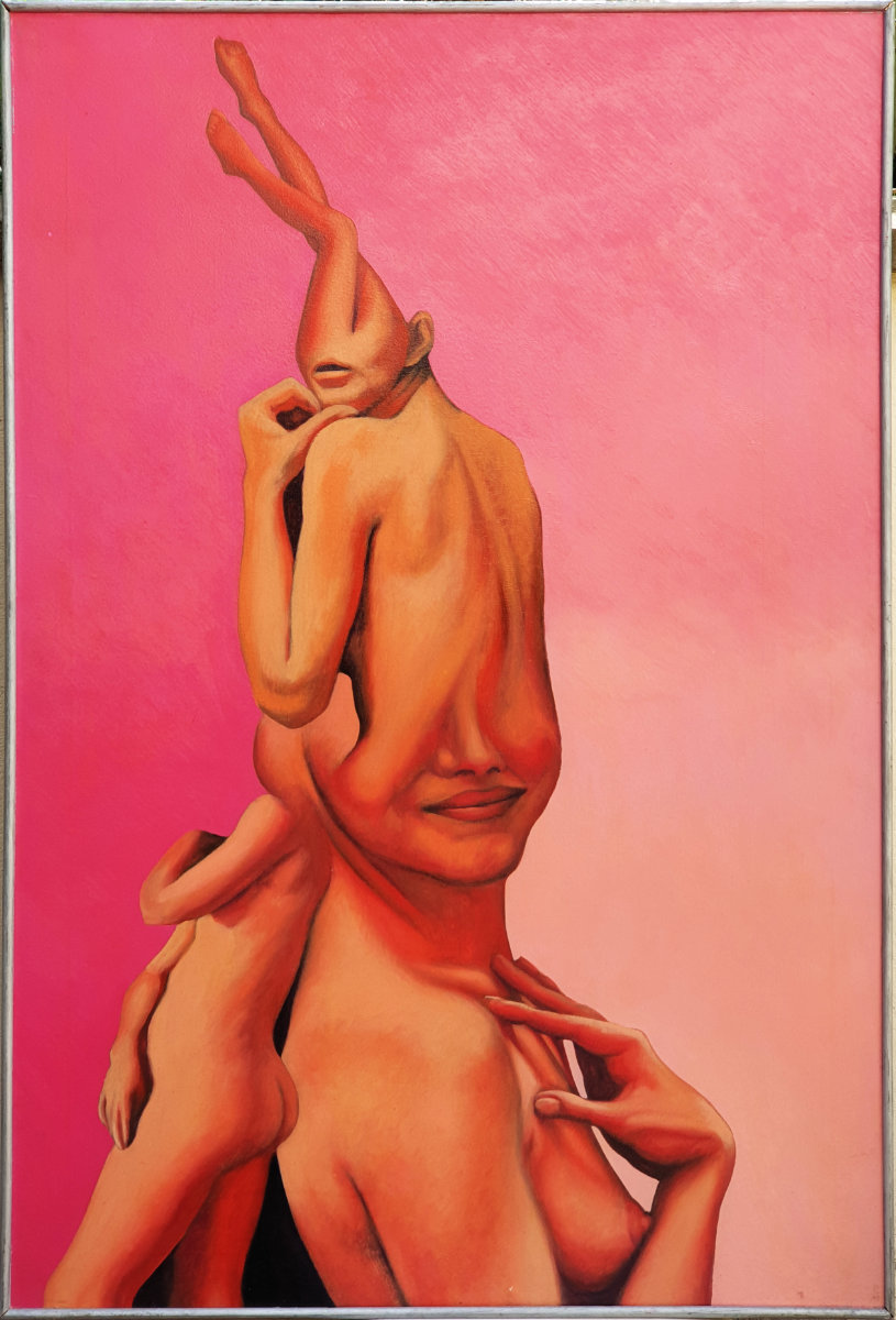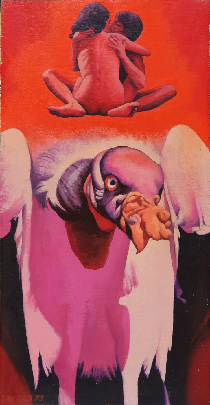 Una riflessione sulla pittura antica mi ha spinto a ridurre la gamma dei colori da usare, e poiché il rosso è sempre stato uno dei miei colori prediletti, ho pensato di escludere la gamma dei verdi e dei blu. Per riaccostarmi alla figurazione ho fatto alcuni collage ritagliando le figure colorate dei rotocalchi in modo non naturalistico, per ottenerne forme a se stanti, e le ho ricomposte secondo criteri astratti. Poi ho ridisegnato e dipinto liberamente quei collage in un postsurrealismo iperrealista che ha caratterizzato tutta la mia produzione fino al 1974. Ne sono venuti quadri con figure realistiche o inventate da me che combinandosi fra loro in modi imprevisti racontano storie.