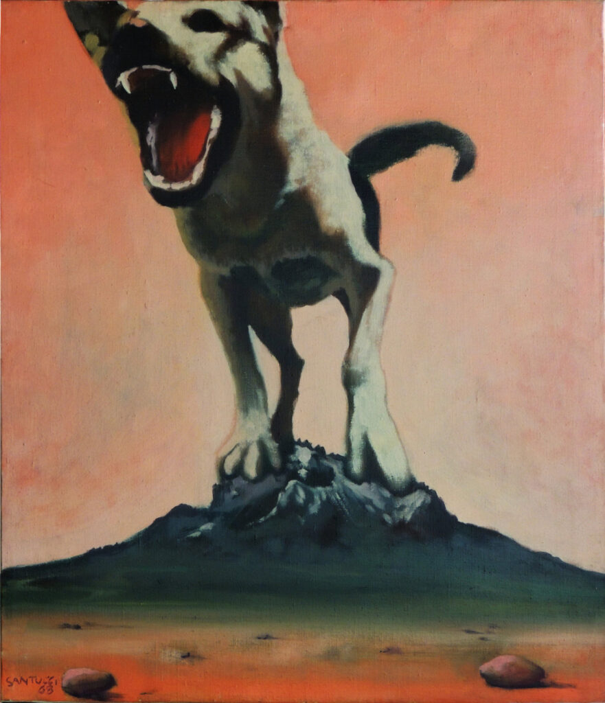 In esso ho voluto rappresentare il concetto di potere attraverso una figura inaspettata. Ho dipinto un banalissimo cane, ma l’ho ripreso con una prospettiva grandangolare dal basso, facendolo apparire così imponente da uscire dai limiti della tela. Non è un semplice cumulo di terra quello su cui si erge, ma una montagna vera e propria, con pareti e ghiacci che contrastano con la distesa deserta e i massi che si vedono in basso. Volevo che il cane sembrasse una figura gigantesca, monumentale, ma al tempo stesso non sembrasse altro che un cane, anche se alienante e alienato dal suo stesso ergersi in una crescita fuori scala. E che la sua furia, il suo abbaiare nel vuoto in un deserto sconfinato, fosse emblema della solitudine di un messaggio che si perde, non trova destinatari.