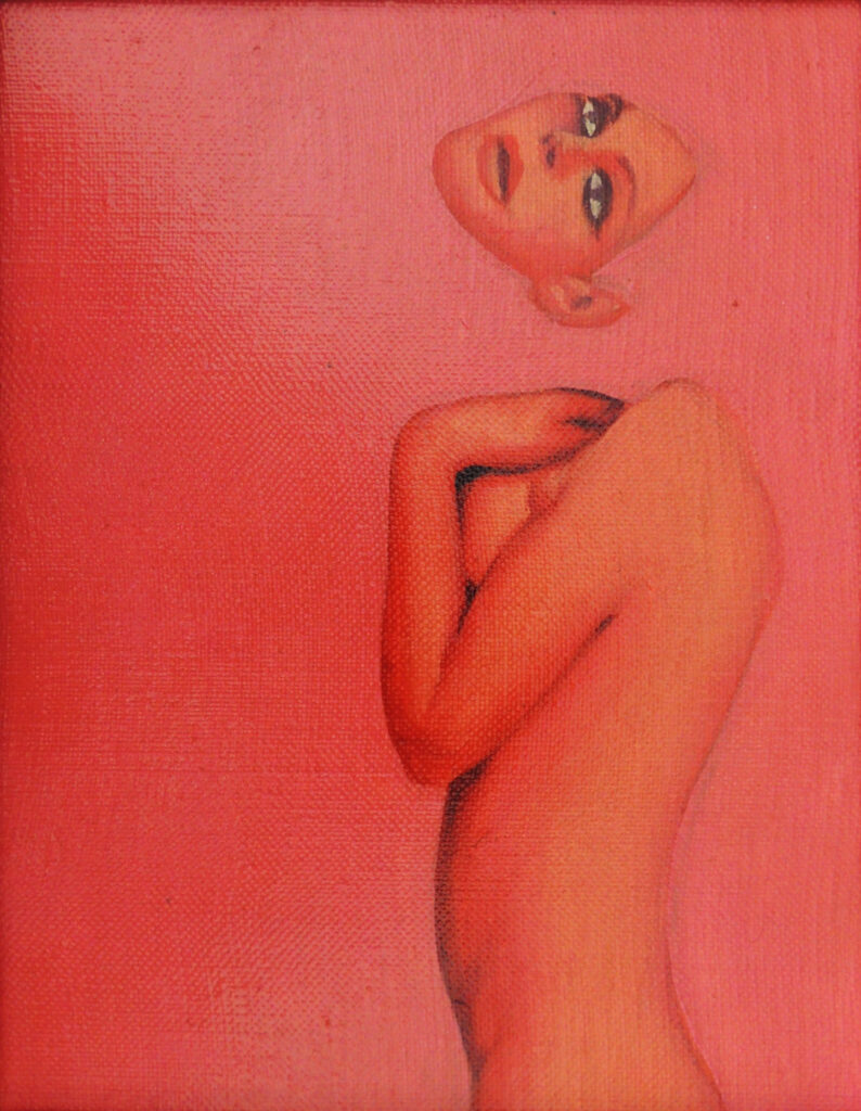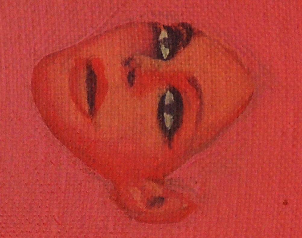 Come nel quadro “Jo in palma di mano” dove il corpo femminile è letteralmente messo dentro il palmo di una mano, anche questo quadro è la rappresentazione letterale del modo di dire popolare. Ma la dimensione onirica stacca la testa dal corpo e la fa fluttuare nell’aria, a suggerire un distacco dalla realtà fisica per volare in un mondo di pensieri, sogni o stati alterati di coscienza, mentre in corpo rimane a terra. Al tempo stesso il volto truccato è la maschera sociale che si stacca dal corpo come qualcosa di estraneo, di intercambiabile con altre maschere e altri trucchi.