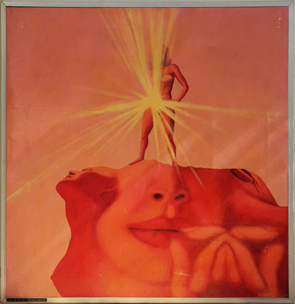 Il plesso solare della ragazza diventa un vero e proprio sole come centro di luce e di calore vitale. I frammenti di volti femminili si compattano fra di loro come solide rocce a formare un piedistallo da cui svetta la gioia, come promessa sublime del femminile nel suo senso più alto. Ma i personaggi nell’atto stesso di mostrarsi si avvolgono di mistero, di inespresso, di sconosciuto, in cui la gioia dei sensi e dell’anima può solo essere immaginata.