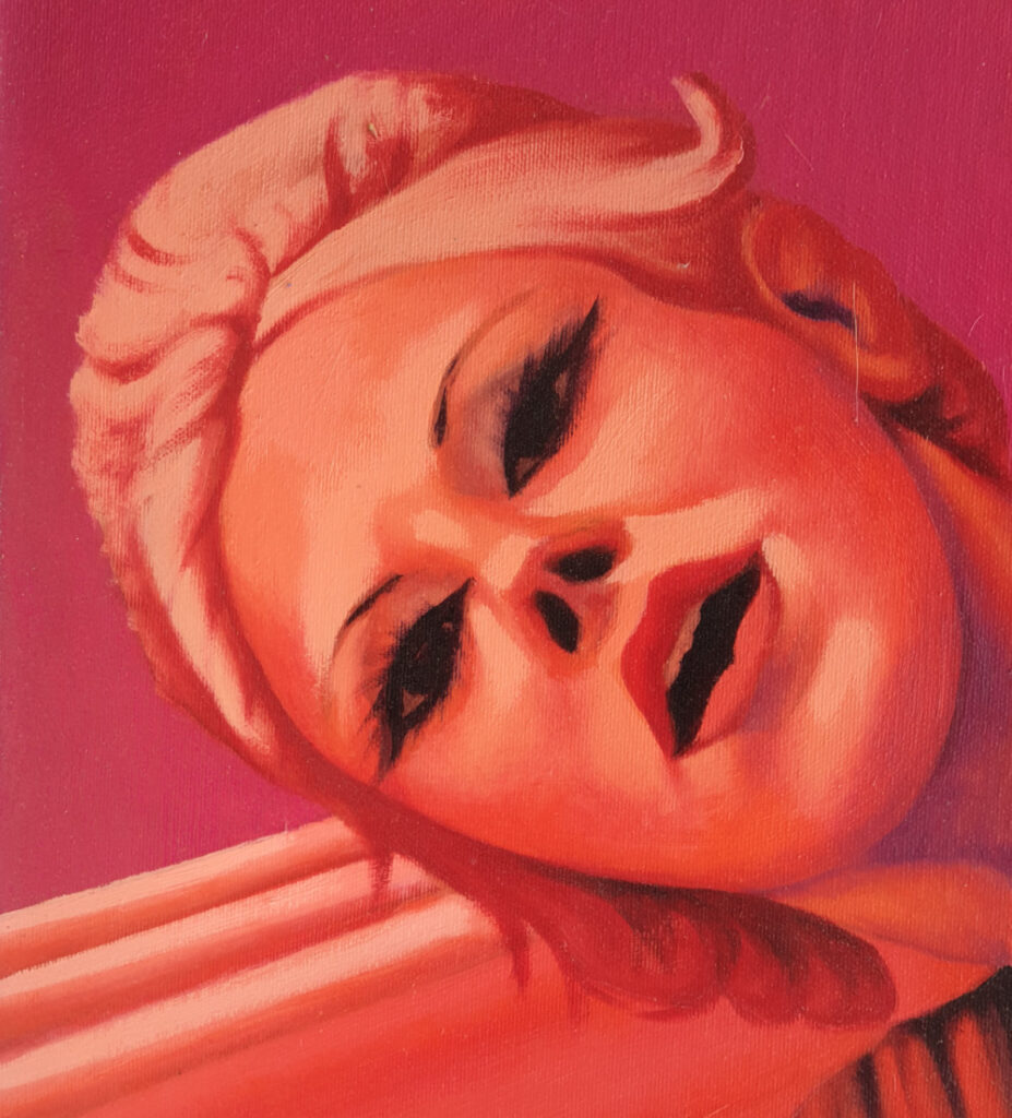 Le “maggiorate fisiche” erano le attrici cinematografiche degli anni ’50, che proponevano un modello di donna fiorente e prosperosa interpretata fra la altre da Gina Lollobrigida, Sophia Loren, Silvana Mangano, Sandra Milo, a cui vagamente si ispira la donna del quadro. Federico Fellini ripropose negli anni ’60 la Milo e Anita Ekberg in chiave parodistica come antitesi a donne meno sensuali ma più interessanti, da Giulietta Masina a Anouk Aimée, e lo stesso intento ha animato la mia scelta, poiché anche per me l’ideale di donna non era una maggiorata, ma una persona interessante, difficile da capire ma sempre stimolante, che era interpretato da attrici come Ava Gardner o Lauren Bacall.
