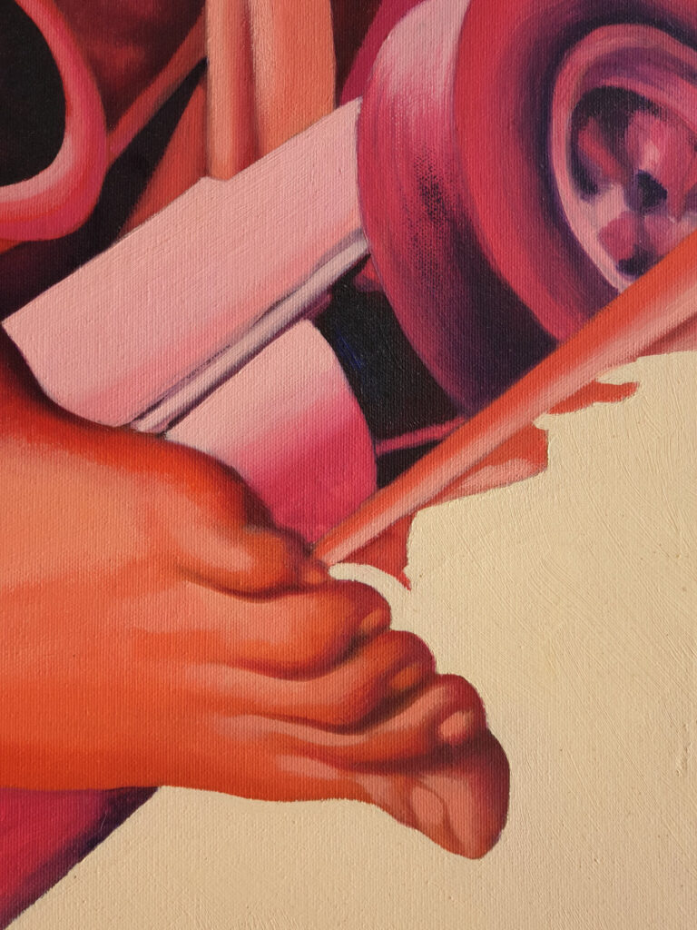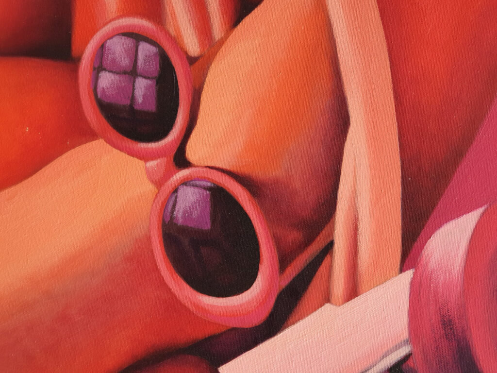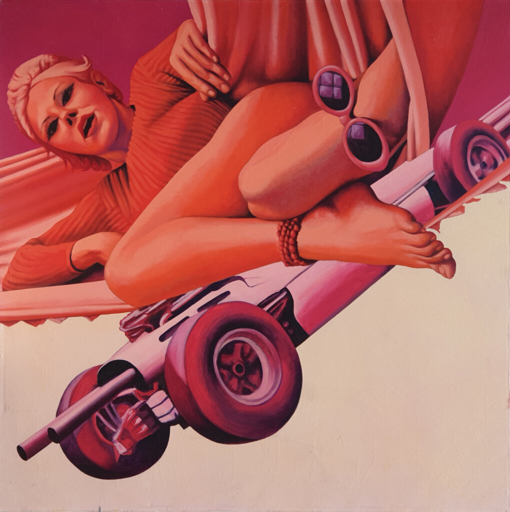 Il maggiorato rumoroso, rappresentato con un’auto di formula da corsa, è il compagno ingombrante e chiassoso della maggiorata, che si esprime attraverso il tubo di scappamento dell’auto da corsa ma che è ancora un gran signore di fronte ai coattoni suv e rolex che sarebbero venuti dopo.