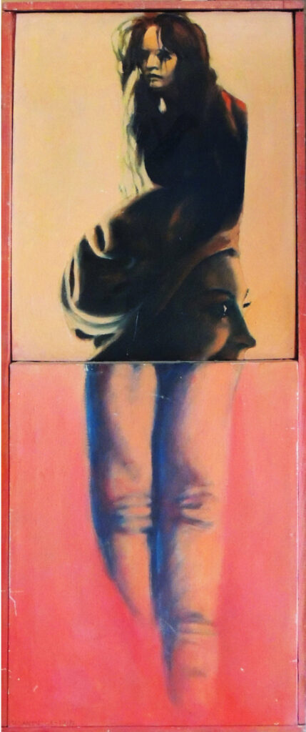 L’atto di “make up” può essere interpretato come l’applicazione di una maschera, una costruzione dell’immagine esteriore, ma anche come il processo di “comporre” o “ricostruire” qualcosa, in questo caso l’identità stessa, che nel quadro è esplorata attraverso una composizione stratificata. Le due forme allungate in basso, pur essendo dita di una mano, evocano in maniera suggestiva le gambe in movimento di una figura che cammina, a suggerire un percorso, un’evoluzione o una ricerca costante. Su questa base dinamica si poggia un profilo di donna, elegante e apparentemente sereno, che può rappresentare l’immagine esteriore o la facciata che presentiamo al mondo. Tuttavia, è da questa stessa figura che emerge un mezzo busto di donna scarmigliata e drammatica, un’esplosione di interiorità che rompe la compostezza e rivela le emozioni più profonde, le tensioni celate.