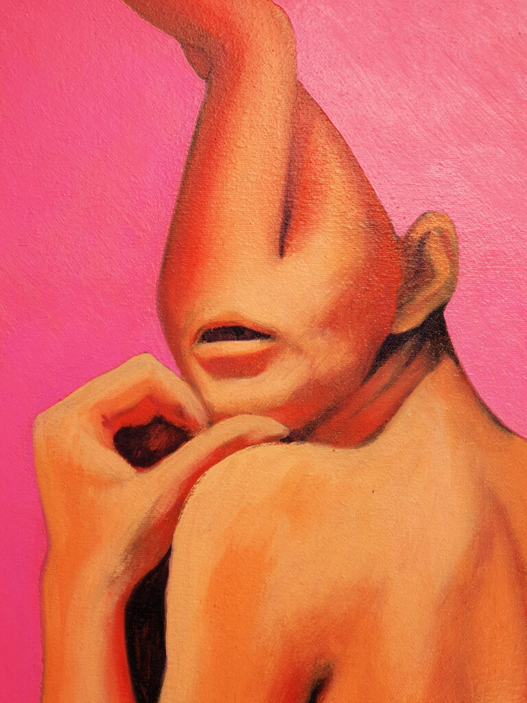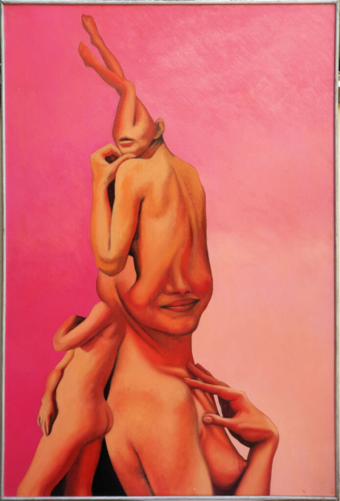 Una ragazza rivolta verso sinistra è chiusa in se stessa nel classico gesto di autoprotezione. La testa scompare fondendosi con la ragazza che indica se stessa (sono proprio io?) e si mostra fiduciosa e dolcemente seduttiva, ma diventa una donna sorpresa da un estraneo che si volta a guardare contrariata. La sua mente però si trasforma in un paio di gambe che camminano verso l’alto. Le figure non hanno gli occhi perché trasformandosi l’una nell’altra non riescono a vedere se stesse e gli altri. Identità fluida, alienazione, contraddizioni interiori si concretizzano nella fusione dei corpi.