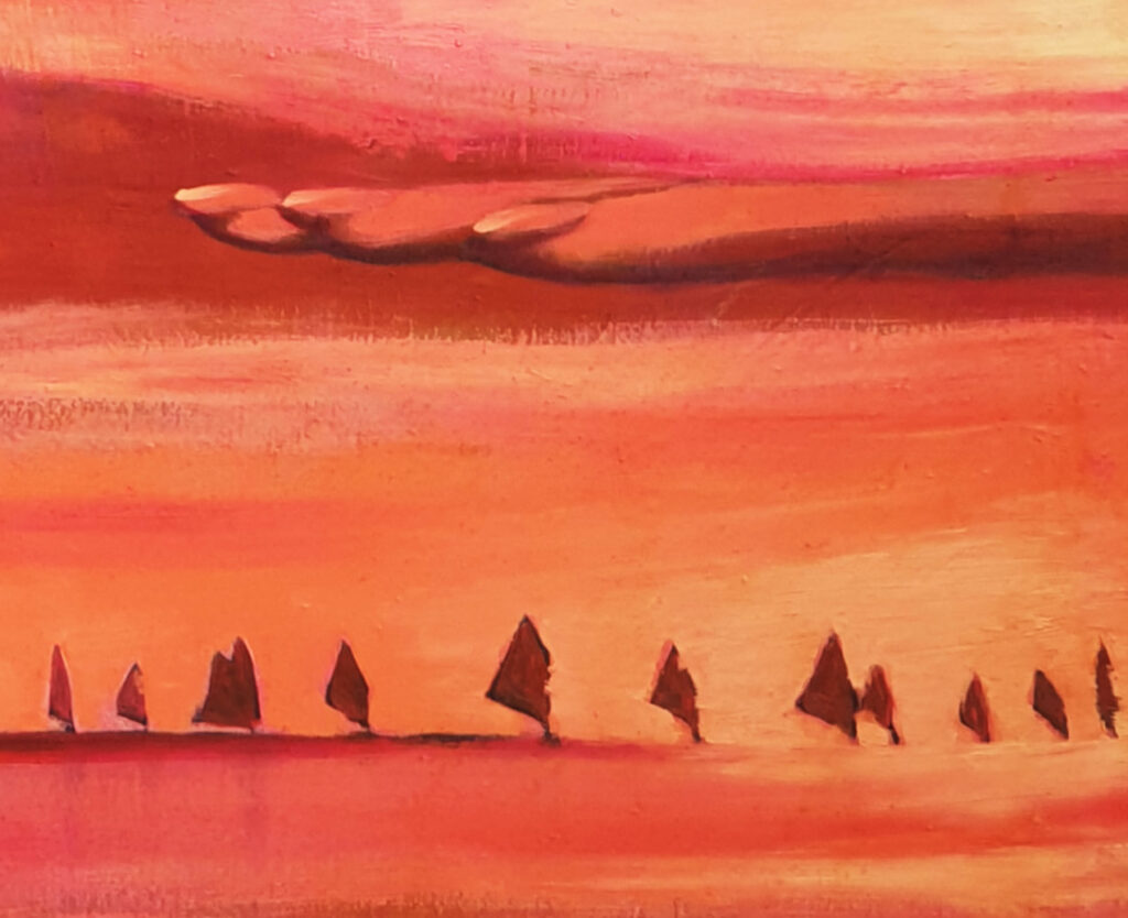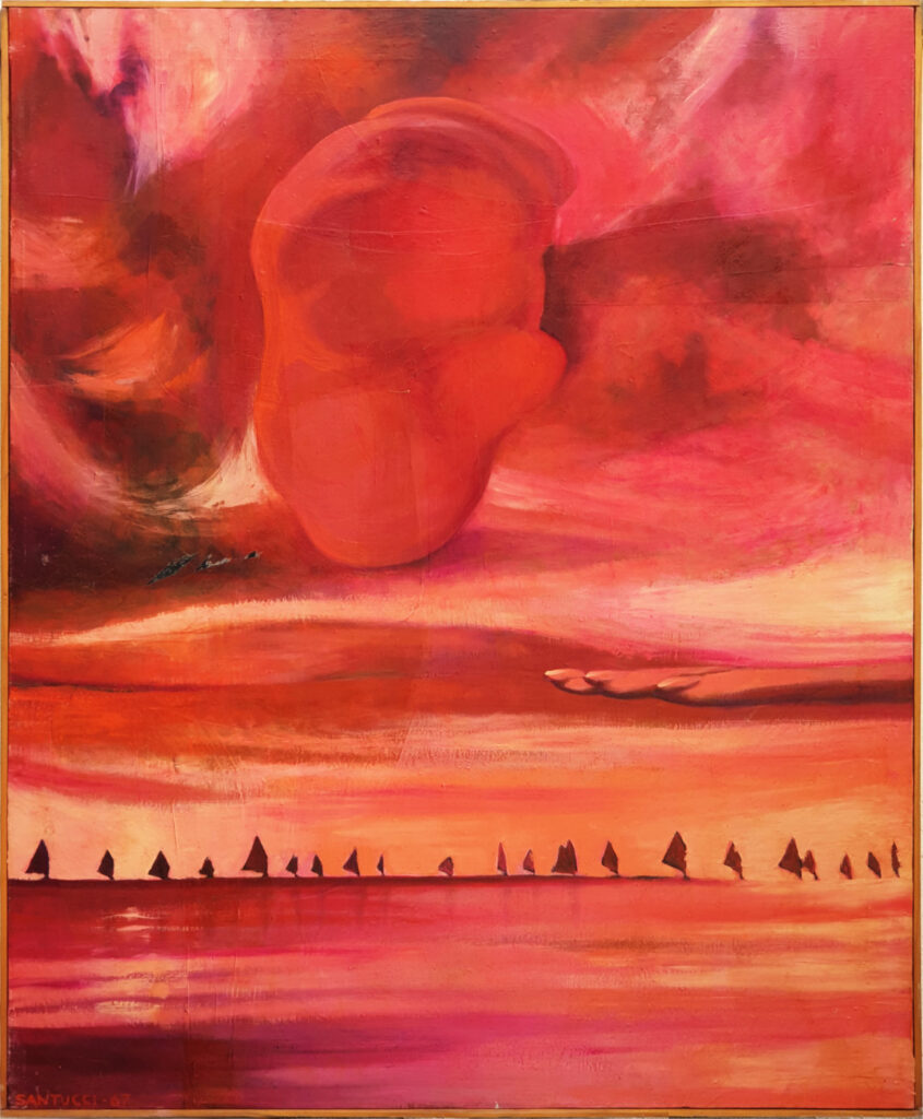 La figura centrale del dipinto, la “pummarola”, è più di un semplice ortaggio. In un cielo minaccioso, come una nuvola temporalesca che sta per generare un fulmine, si presenta come un’apparizione inaspettata. Questo pomodoro non è solo un riferimento critico alla tradizione dello “stra-paese” italiano, ma è anche un esempio di configurazione secondo le teorie della percezione gestaltica: il nostro cervello cerca una forma familiare nel caos delle nuvole, trasformando l’informe in qualcosa di riconoscibile. Ma l’energia del futuro che arriva è nell’elettricità temporalesca, non nel tranquillizzante e al tempo stesso inquietante pomodoro. L’incertezza del cielo non è ancora l’esplosione dei movimenti sociali, ma l’inquietudine palpabile di un’epoca in fermento. Le scosse telluriche della beat generation e della pop art si scontrano con l’inizio della guerra del Vietnam, il golpe dei colonnelli in Grecia, le tensioni del Medio Oriente, mentre i Beatles escono con l’album Sgt. Pepper’s Lonely Hearts Club Band. La “pummarola” diventa così un’immagine emblematica della tradizione che, sotto la pressione di un futuro imminente e sconosciuto, sta per deformarsi e decomporsi.