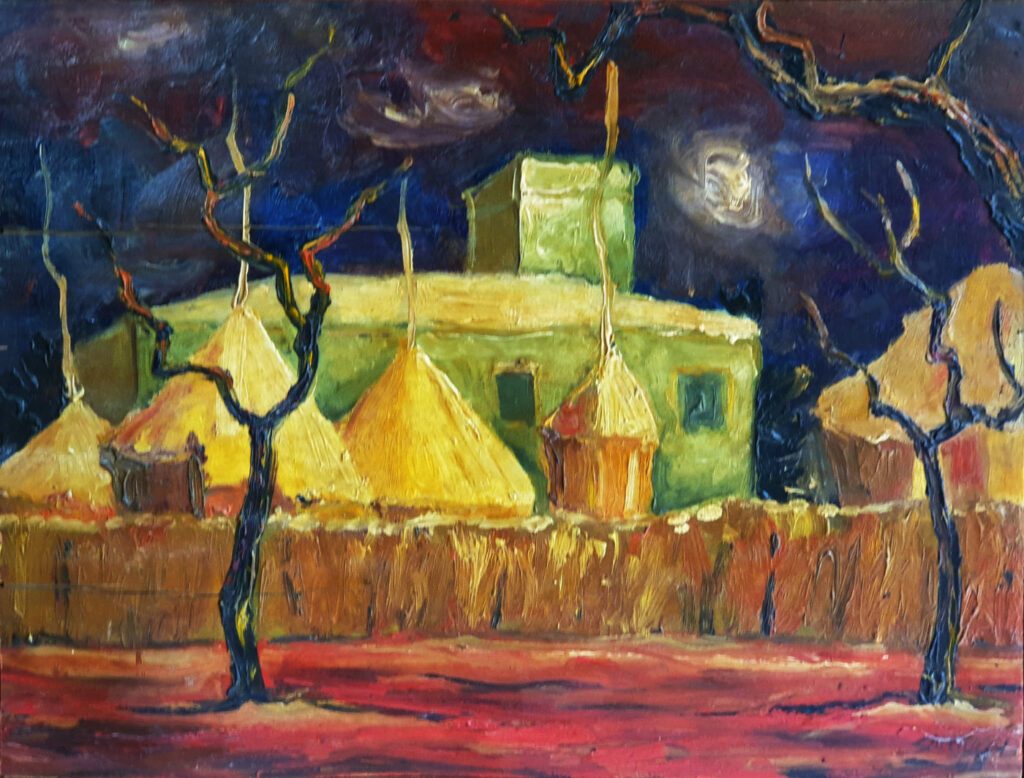 Avendo in mente la pittura di Van Gogh e nel cuore quel ricordo di bambino, ormai ventenne, ho dipinto la nostra villa vista da dietro, in una atmosfera tempestosa di inizio inverno, con i pagliai e gli alberi già spogli.